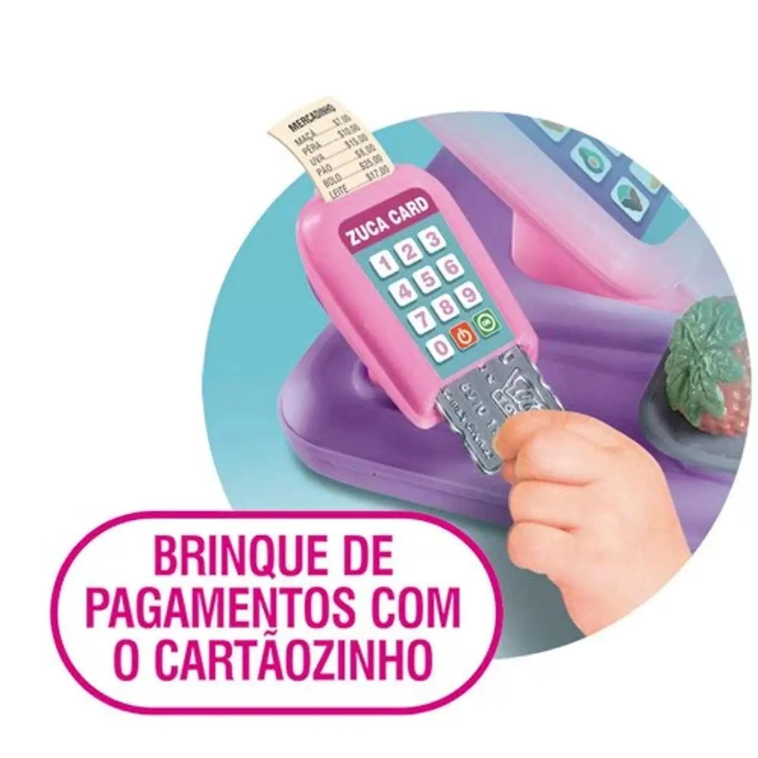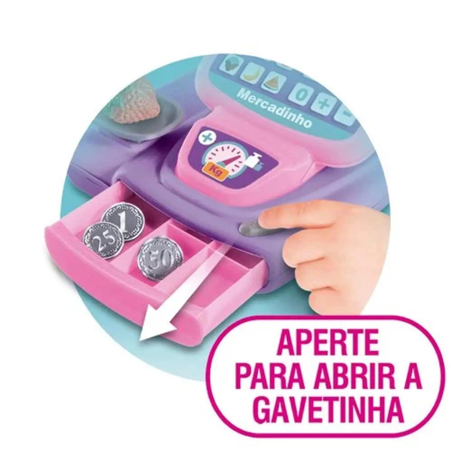 Ela conta com miniaturas de produtos de supermercado, além do simulador de leitor de produtos para que o faz de conta fique perfeito e ainda acompanha as moedinhas